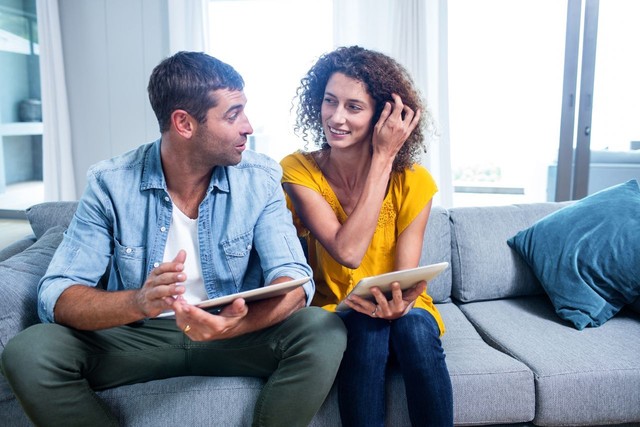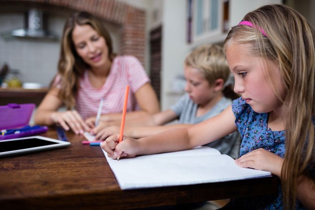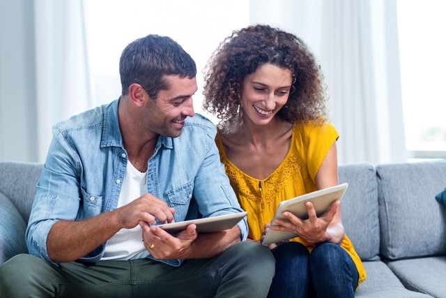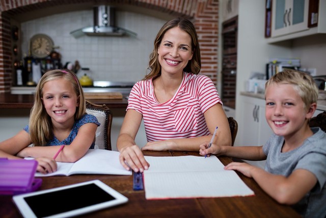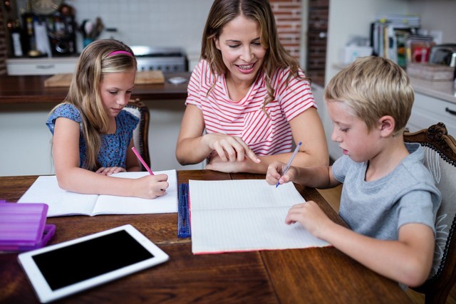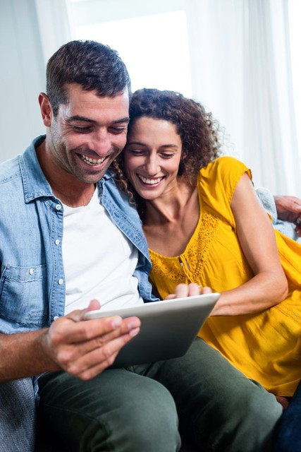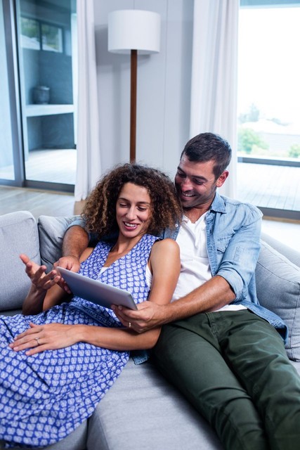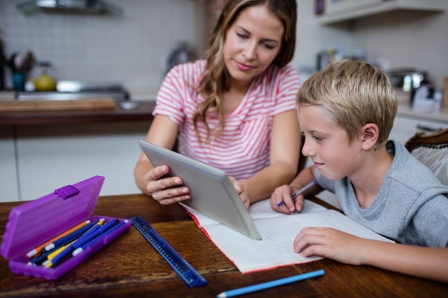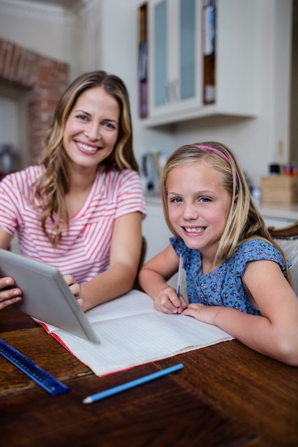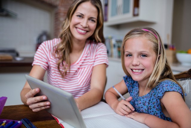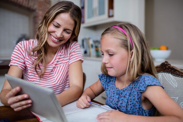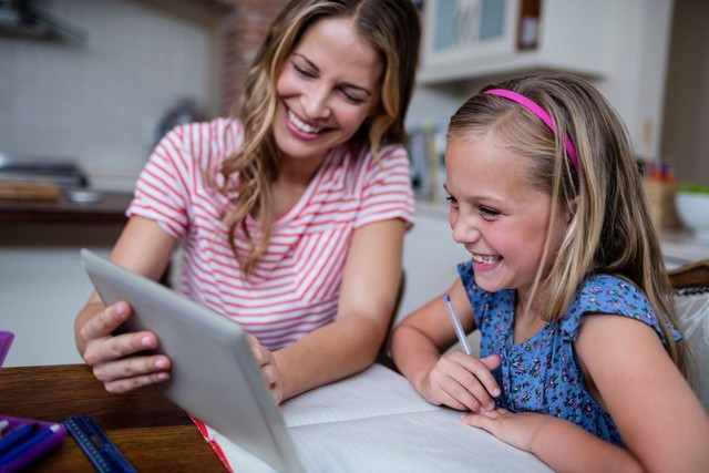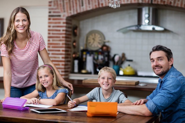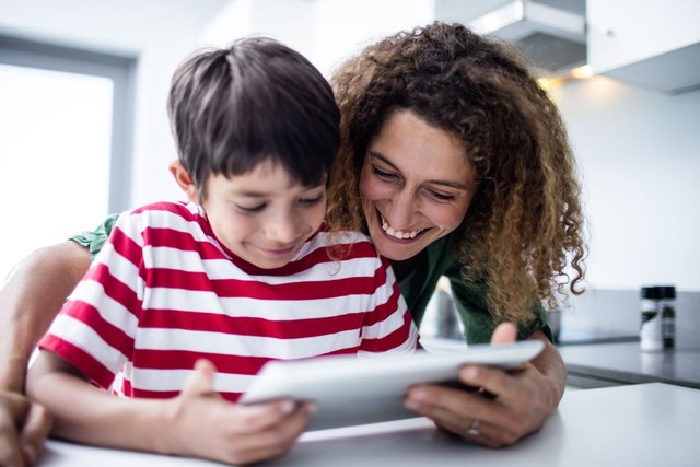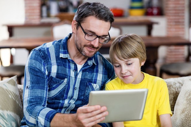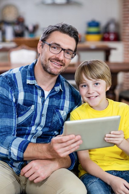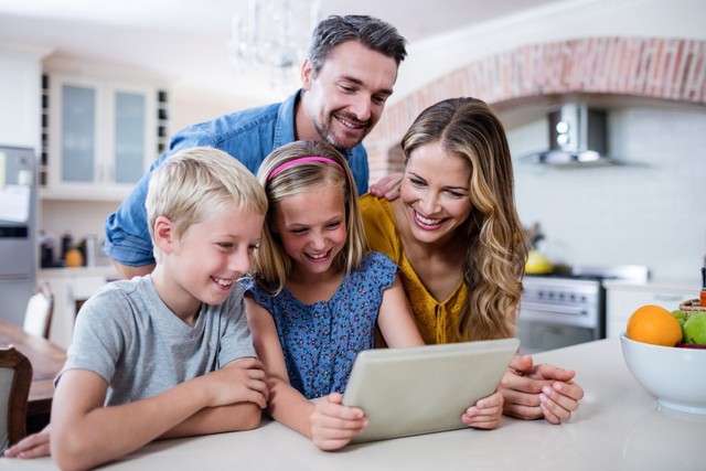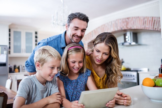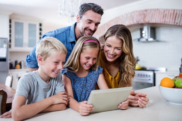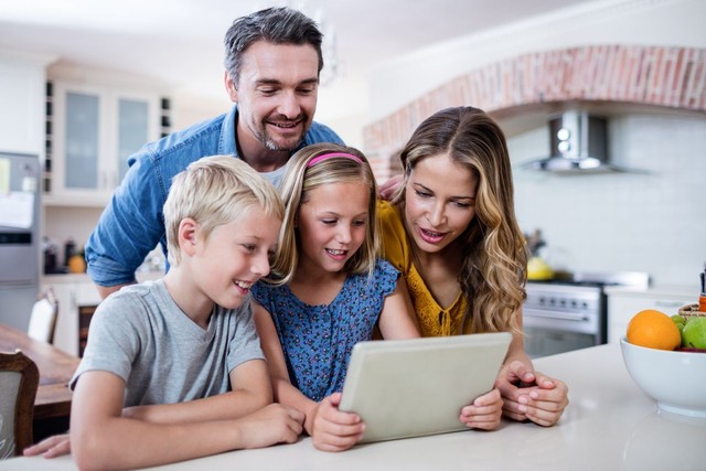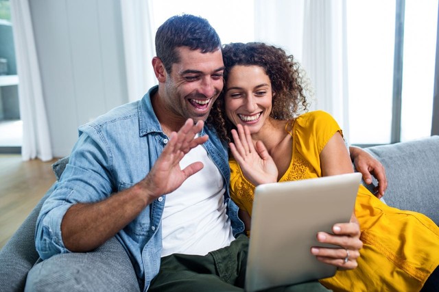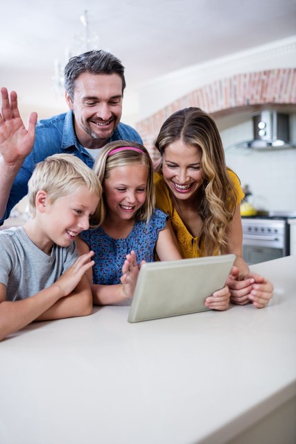 父母和孩子在使用数字平板电脑进行视频聊天时挥手