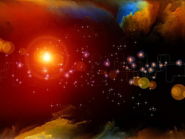 Abstract composition of fractal nebula, virtual network and lights on the subject of modern technology, science and education
