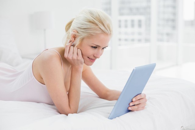 内容休闲年轻的金发女郎在床上使用平板电脑