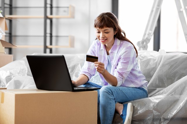 搬家、人和房地产概念——新家有笔记本电脑和信用卡的快乐微笑的亚洲女人。新家有笔记本电脑和信用卡的女人