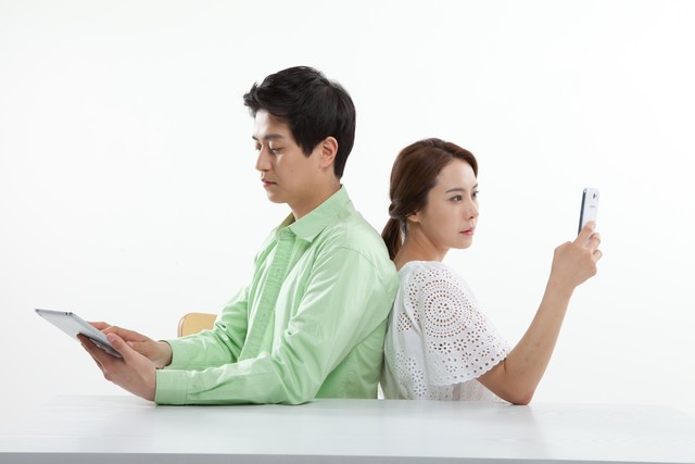 微笑的家庭在客厅使用数字平板电脑、手机和笔记本电脑