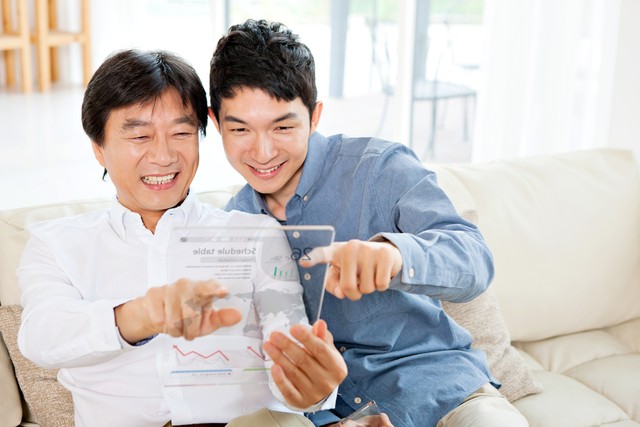 微笑的父亲坐在儿子旁边,沙发上放着笔记本电脑