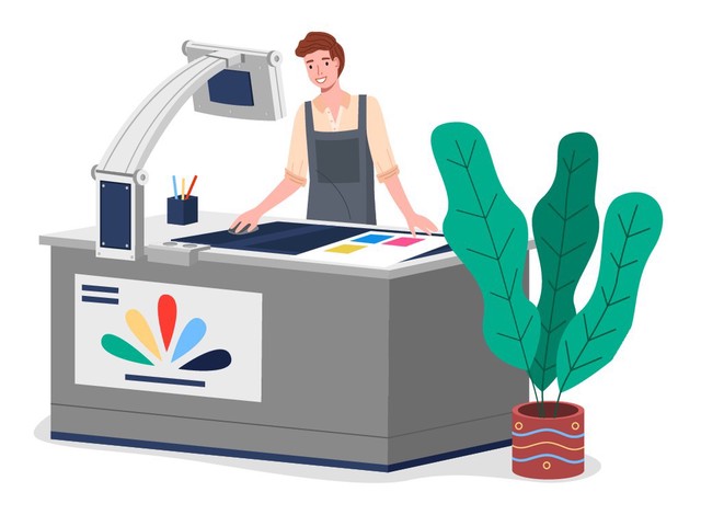 年轻人在印刷到打印机的排版工作。概念员工角色,电子设备,笔记本电脑和电脑,油漆服务。矢量插图打印房屋工人孤立在白色。年轻人在印刷到打印机的排版工作。员工角色,油漆服务隔离