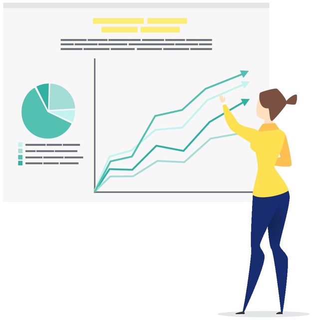 从事统计工作的年轻女性,利润图表的增长。用统计指标介绍财务报告。女孩展示数据分析、收入增长、商业研究的结果。从事统计工作的年轻女性,利润图表的增长,财务报告的介绍