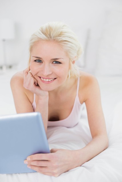 微笑休闲年轻的金发女郎与平板电脑在床上
