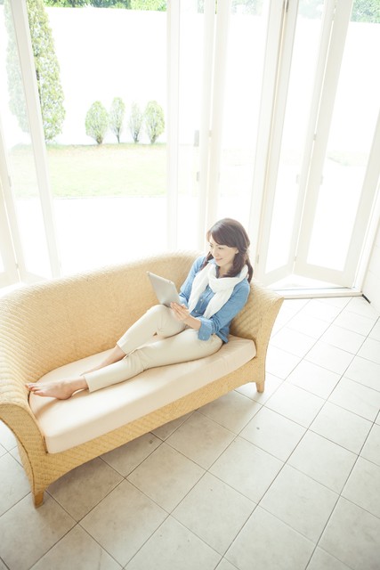 高级朋友的正视图,数字平板电脑坐在沙发上,看着相机