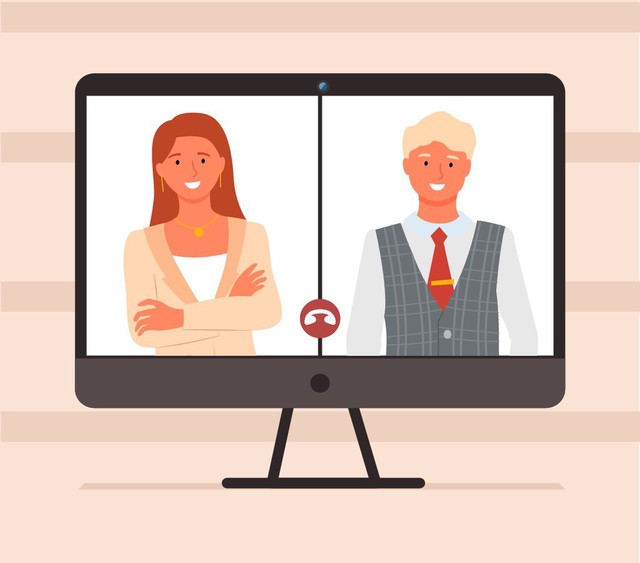 互联网上的视频会议。电脑屏幕上的卡通人物。隔离时代的家庭办公室。在线虚拟交流,男人正在视频聊天矢量插图上与女人交谈。互联网上的视频会议。笔记本电脑屏幕上的人。在线虚拟交流
