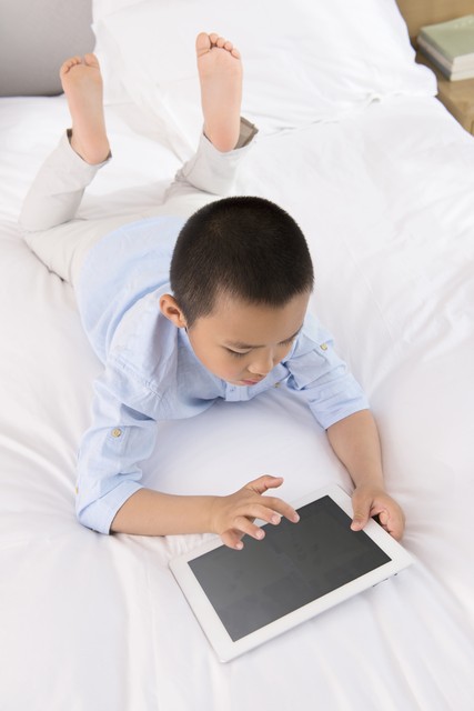 母亲和她的孩子在卧室的毯子下使用数字平板电脑