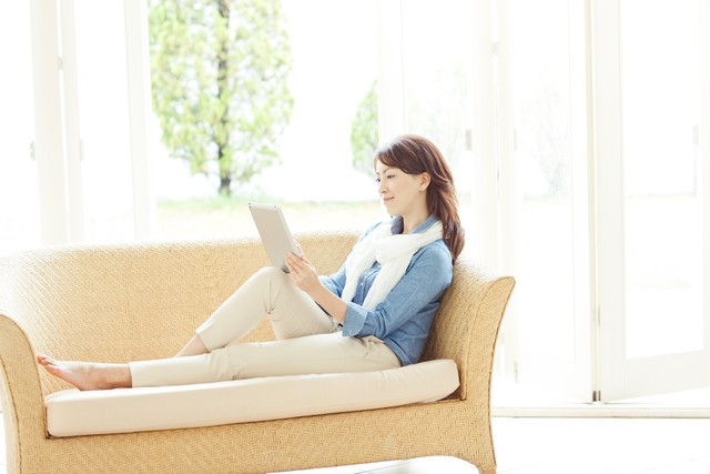 年轻女子拿着咖啡杯,使用数字平板电脑
