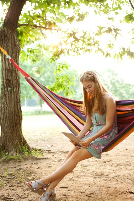 幸福的家庭在卧室的毯子下使用数字平板电脑