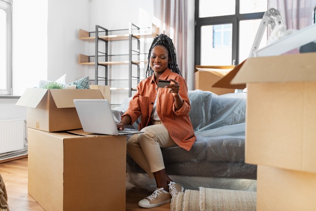 搬家、人和房地产概念——新家有笔记本电脑和信用卡的快乐微笑的女人。新家有笔记本电脑和信用卡的女人