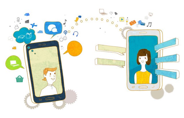 在客厅使用手机、数字平板电脑和笔记本电脑的幸福家庭