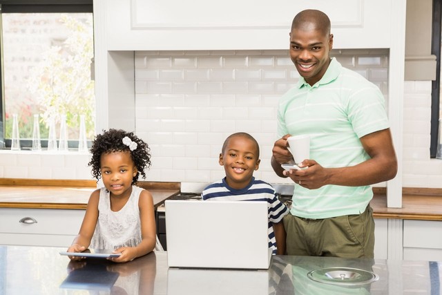 非裔美国妇女在客厅工作,使用笔记本电脑、文书工作和智能手机通话