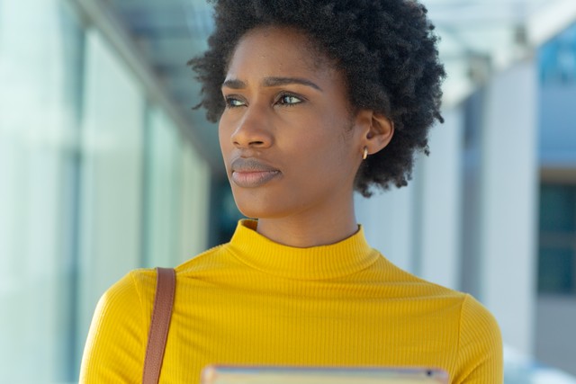 深思熟虑的非裔美国年轻女商人,留着非洲发型,看着工作场所