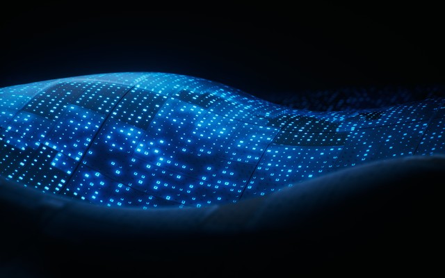 一块集成电路板上的芯片处理器上写着AI字母,一个高科技的场景,中心是一个带有“AI”标记的芯片