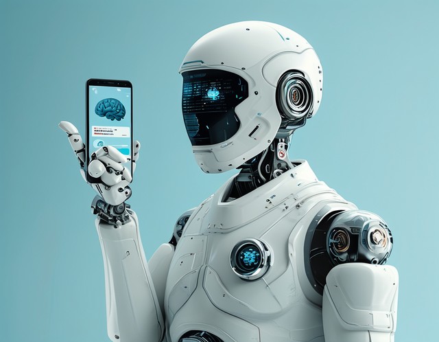 3D插画医生在技术背景下展示了一个机器人。通过短信将人工智能融入医学的概念。孤立的浅蓝色背景