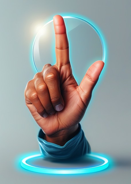 虚拟指纹扫描界面在空旷的现代办公室背景上多重曝光,数字访问概念