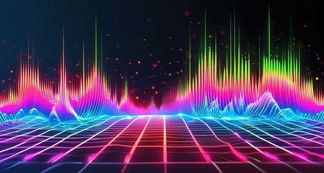 彩色声波。音频数字均衡器技术,音乐脉冲矢量插图。声线波形或音量级符号。曲线无线电波