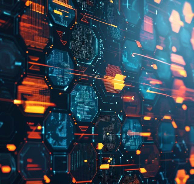 六边形图案和箭头的数字数据技术概念。大数据可视化、网络连接和通信背景设计。