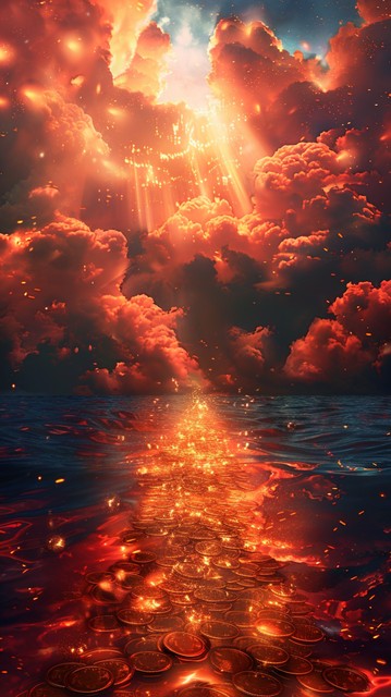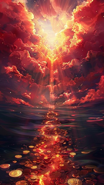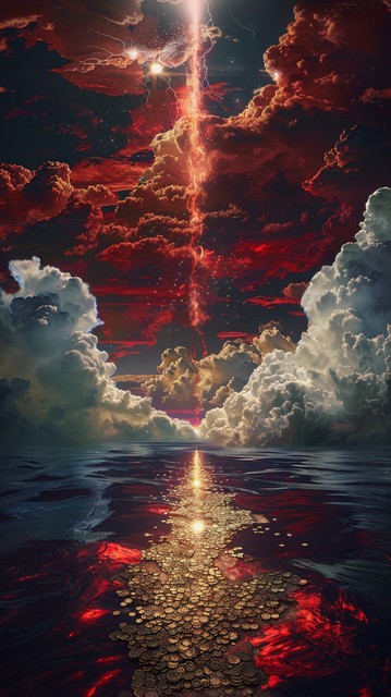 天空中的红河,两侧红色和白色云朵,背后光束,地面暗蓝色水反射上方色彩。