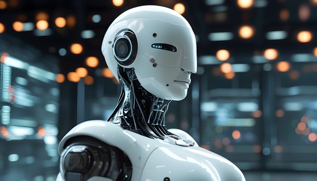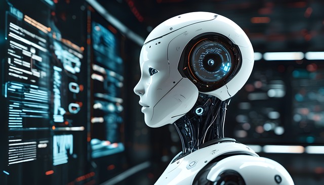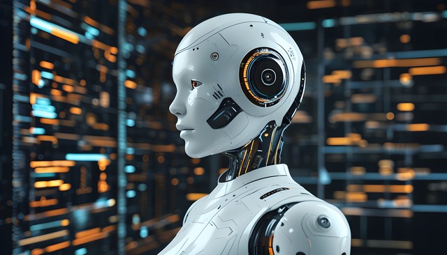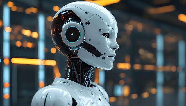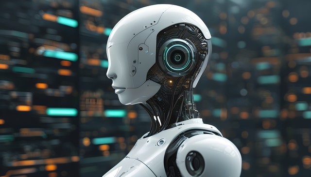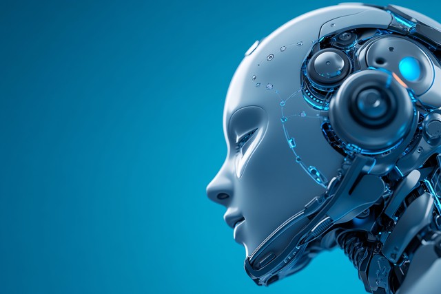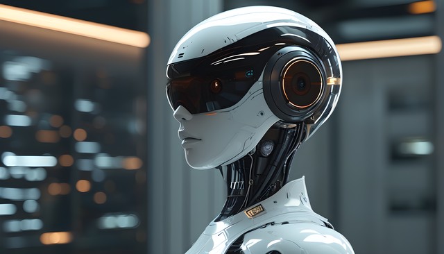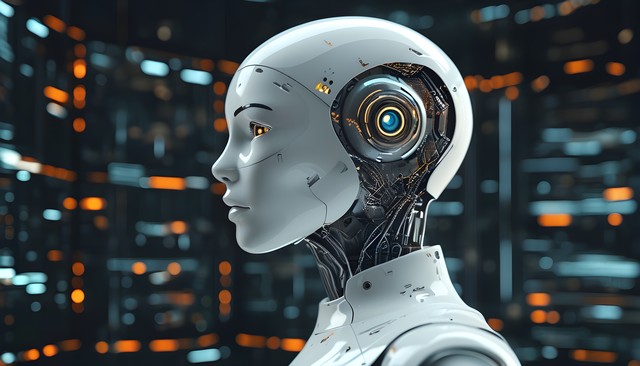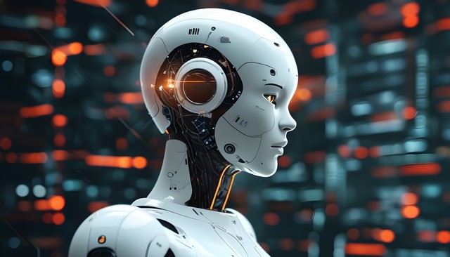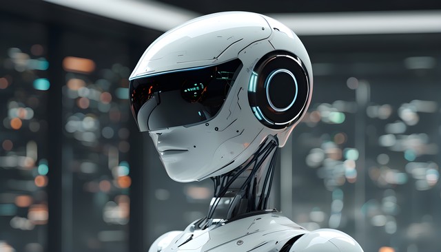 未来科技感十足的机器人头部特写,展示了精密的内部结构和光泽的外壳。