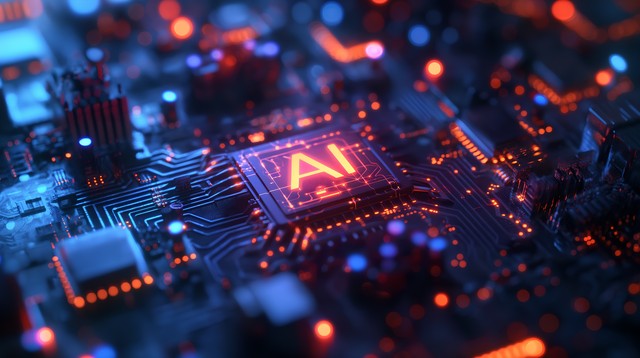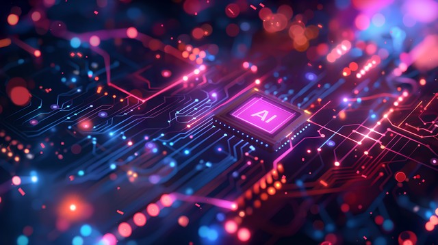 抽象的未来主义数字背景深蓝色背景上发光的“AI”文本和电路板元素AI技术概念
