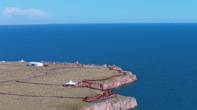 航拍青海湖断崖景区高原圣湖蓝天白云湖水