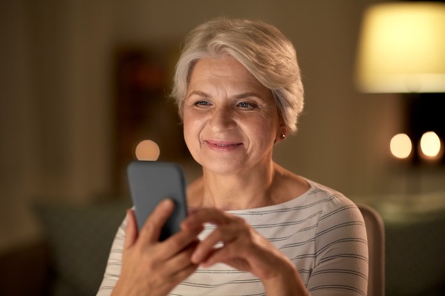 technology, communication and people concept - happy senior woman with smartphone at home in evening. happy senior woman with smartphone at home
