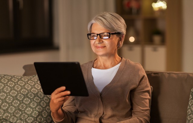 technology, old age and people concept - happy senior woman with tablet pc computer at home in evening. happy senior woman with tablet pc at home at night