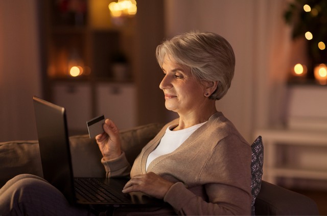 technology, online shopping, age and people concept - happy senior woman with laptop computer and credit or bank card at home in evening. senior woman with laptop and credit card at night
