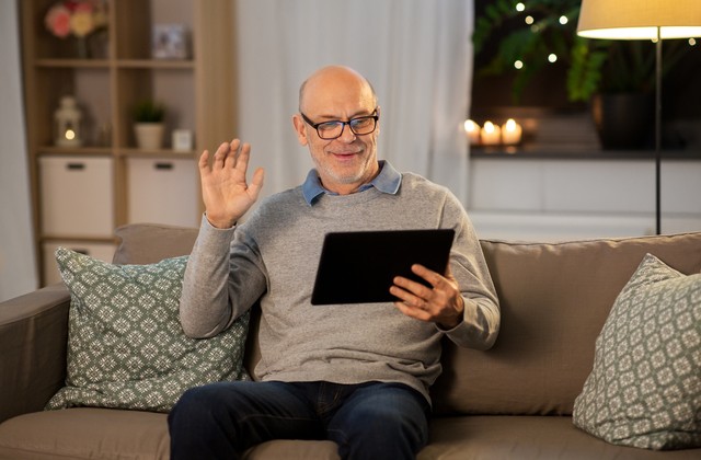 technology, old age and people concept - happy smiling bald senior man with tablet pc computer having video call at home in evening. old man with tablet pc having video call at home