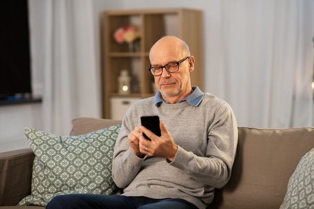 technology, people and communication concept - bald senior man texting on smartphone at home in evening. senior man texting on smartphone at home