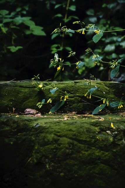 青石青苔藓,绿荫绿树丛,秋风忽吹过,黄花落一层。