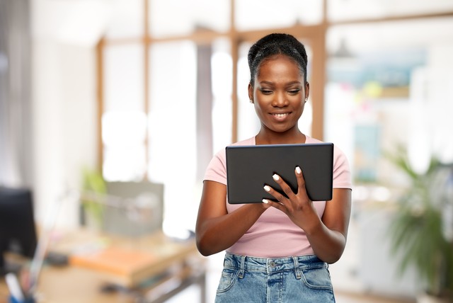 technology, corporate and people concept - happy african american woman using tablet computer over office background. african american woman with tablet pc at office