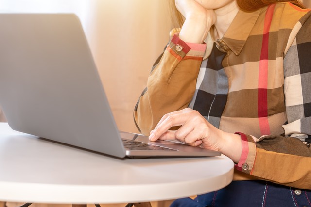 坐在办公室的窗户旁的职业女性正在操作一台笔记本电脑