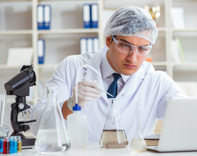Young researcher scientist doing a water test contamination experiment in the laboratory. Young researcher scientist doing a water test contamination expe