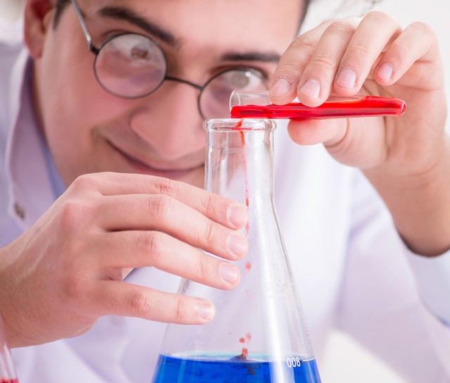 The mad crazy scientist doctor doing experiments in a laboratory. Mad crazy scientist doctor doing experiments in a laboratory