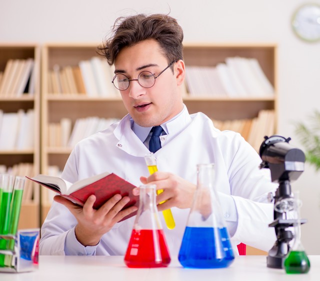 The mad crazy scientist doctor doing experiments in a laboratory. Mad crazy scientist doctor doing experiments in a laboratory