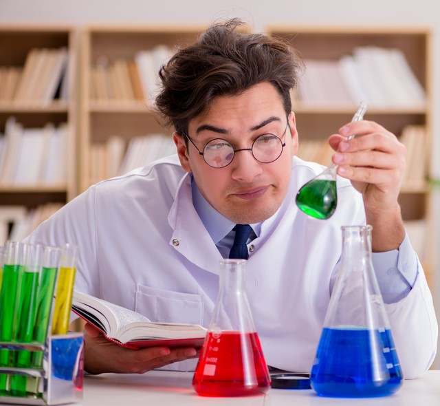 The mad crazy scientist doctor doing experiments in a laboratory. Mad crazy scientist doctor doing experiments in a laboratory