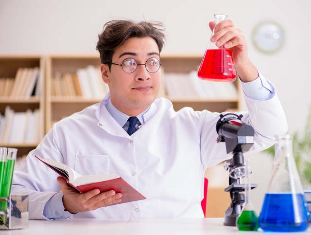 The mad crazy scientist doctor doing experiments in a laboratory. Mad crazy scientist doctor doing experiments in a laboratory