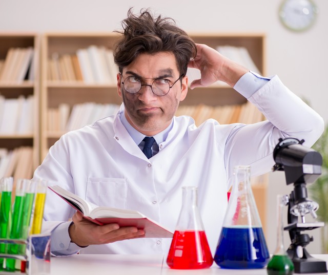 The mad crazy scientist doctor doing experiments in a laboratory. Mad crazy scientist doctor doing experiments in a laboratory