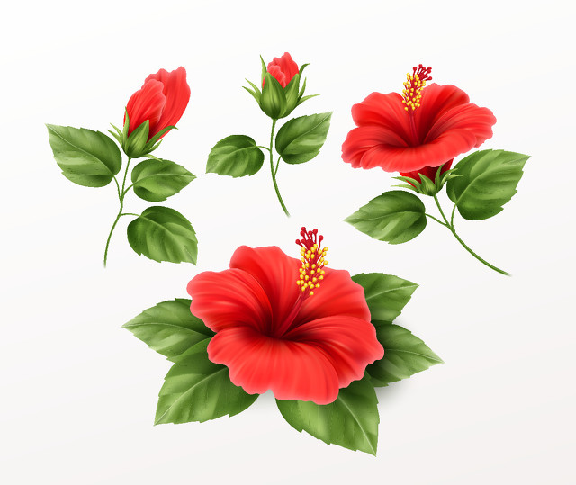 Set is beautiful hibiscus flower, buds and leaves isolated on white background. Exotic tropical plant realistic vector illustration EPS10. Set is beautiful hibiscus flower, buds and leaves isolated on white background. Exotic tropical plant realistic vector illustration