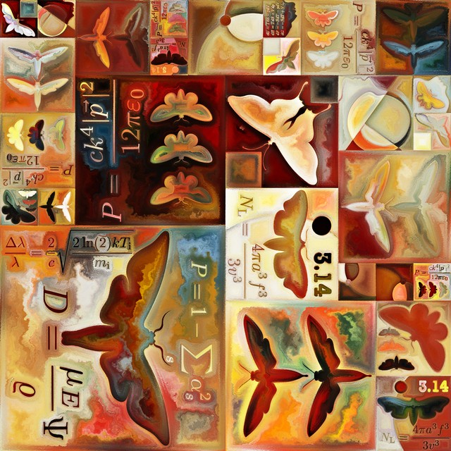 Inner Encryption series. Collage of abstract organic forms, math formulas, art textures and colors on subject of hidden meanings, sacred life, drama, poetry, mysticism and art.