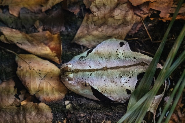 加蓬蝰蛇,又称加蓬咝蝰,伪装在落叶之中