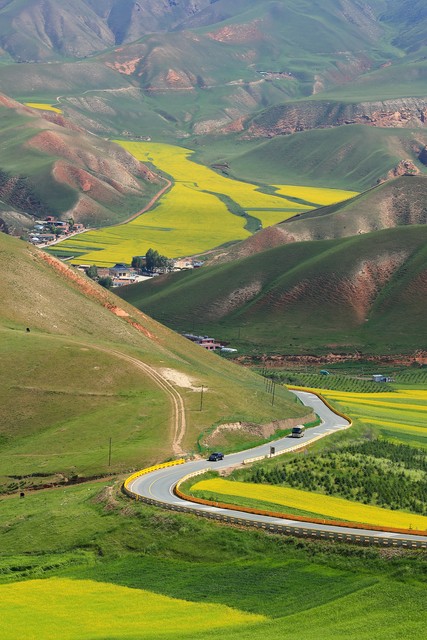 青海省祁连县七彩丹霞和卓尔山下的美丽乡村。