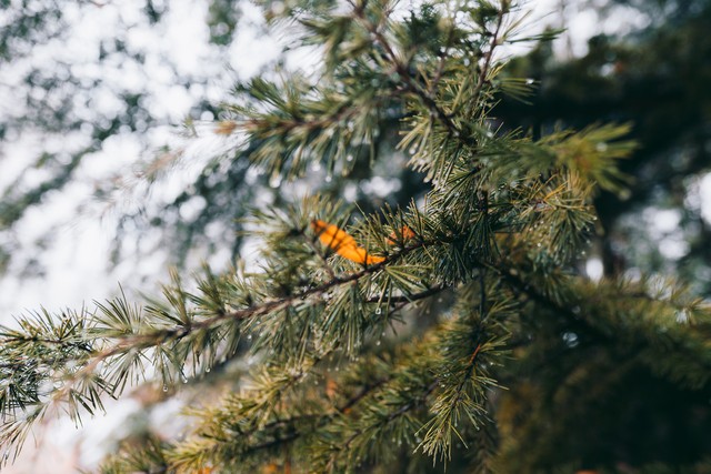 橘黄色的落叶落在雪后的松树树枝和松针上