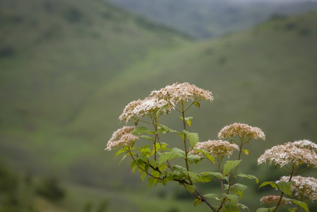 陕南的神田草原在阴雨中迷雾漫漫,在蓝天白云下青草幽幽。