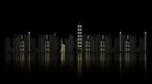 黑色背景上虚拟金色粒子数字城市夜景天际线