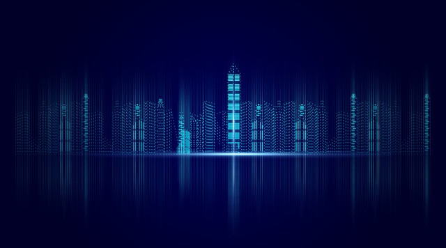 深蓝色背景上虚拟粒子数字城市夜景天际线