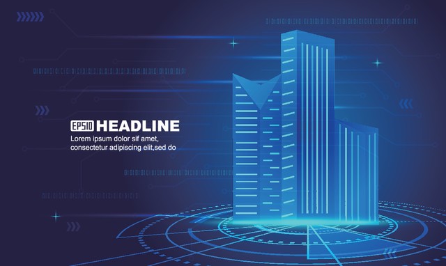 蓝色电路板转盘上建筑未来城市概念矢量背景